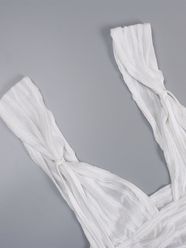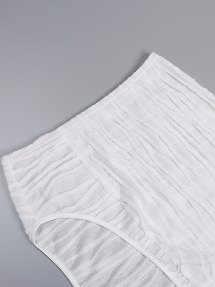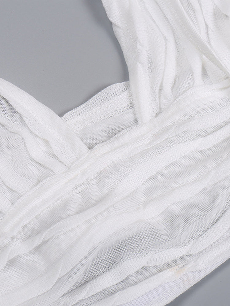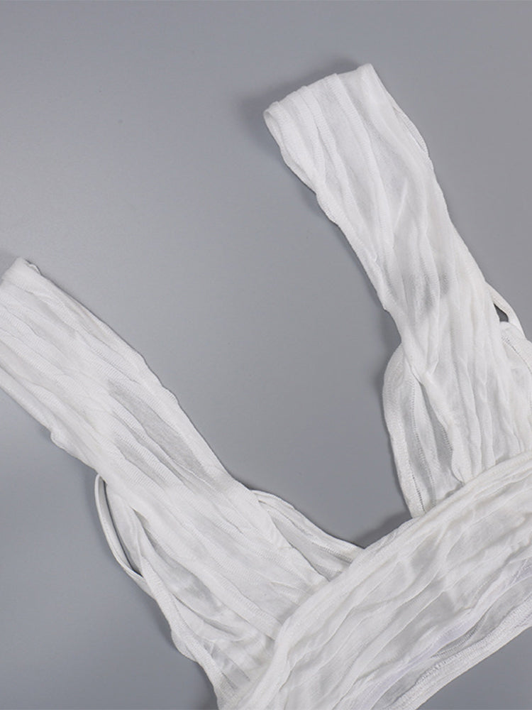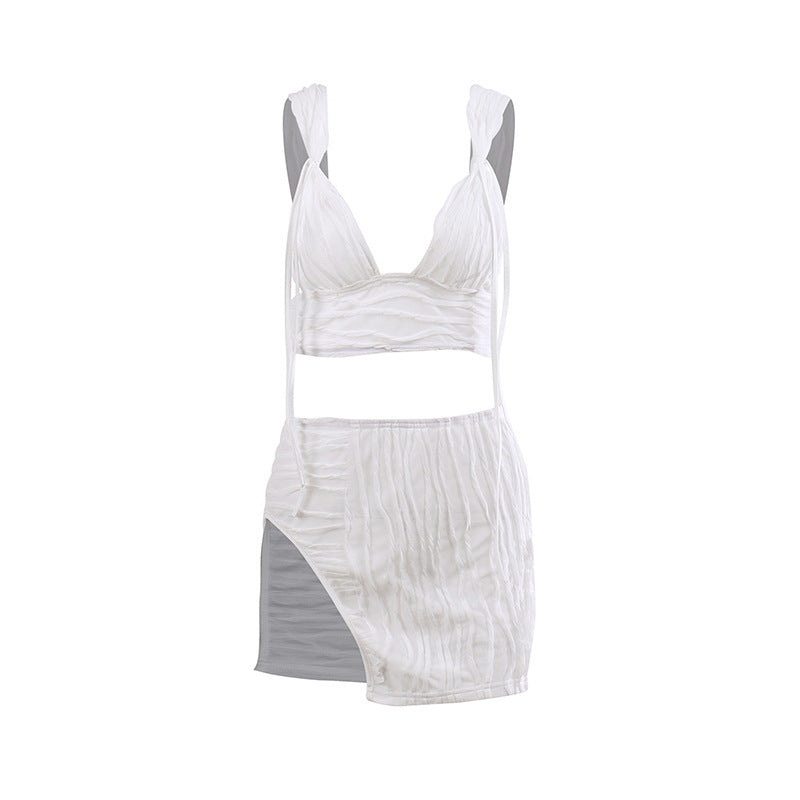 The best paths lead to the beach. The Ashley Beach Set features a matching bandage style mini skirt and matching crop top bralette. The bralette top has a triangle top, thick straps, v-neckline, cropped cut, and the matching skirt has an elasticated waist and slight slit in the mini skirt. Semi-sheer. Style yours post summer sun at a beach or poolside hangout, festival or vacay or all white bash. No zippers; pullover closure.