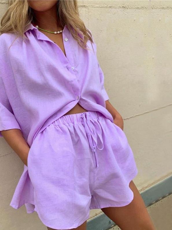 Restocked! Nothing cooler, and more comfortable. The Astrid Oversized Lounge Set features an oversized solid top with a turn-down collar, single button closure, and matching short bottoms with an elasticated drawstring waist. Leave semi-unbuttoned, or style the poplin t-shirt with your favorite pair of denim or leggings. Either way, you're in for a relaxed fitting, flattering, and comfortable fit.