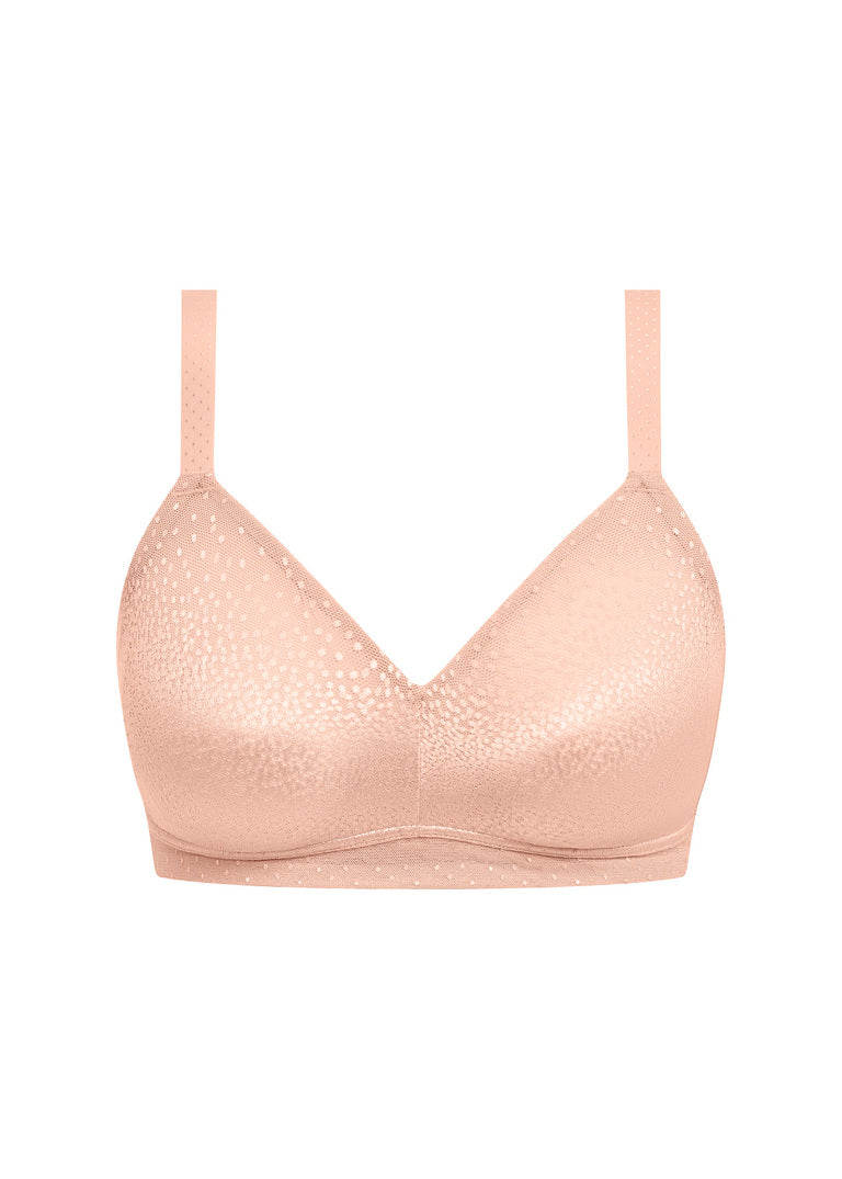 - Mid coverage two-ply cups of soft inner fabric covered with pretty dot jacquard with accent sheen
