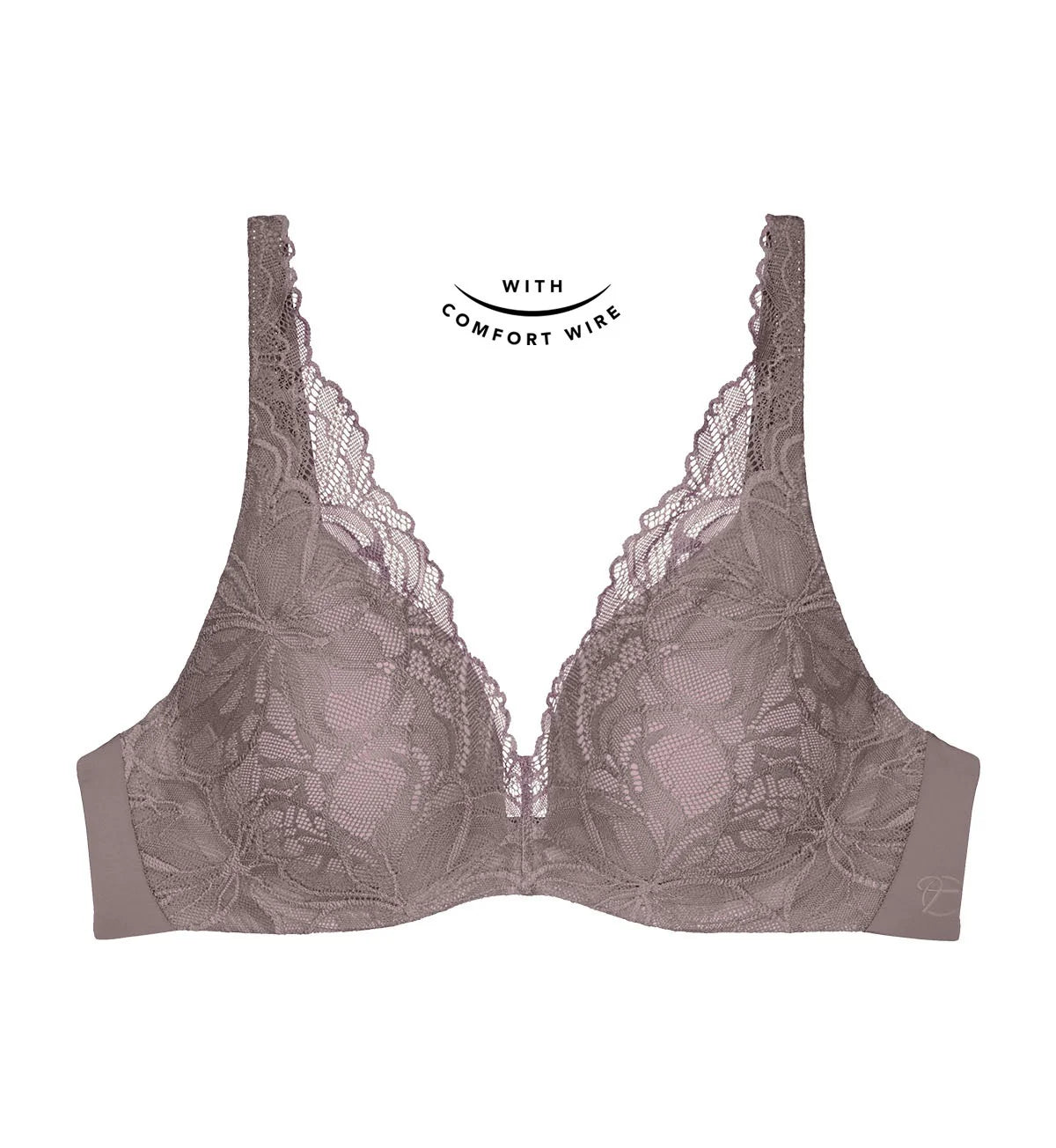 A wired padded deep neck bra with flexible wire and vanishing cup edges. Its made with special cup which centralizes and lifts the breast. The integrated cup cushion adjusts the lift, stronger for smaller busts, gentler for larger ones. It is a bra women can trust but do not feel. Made with smooth lace and creamy soft micro fibre, both partially recycled