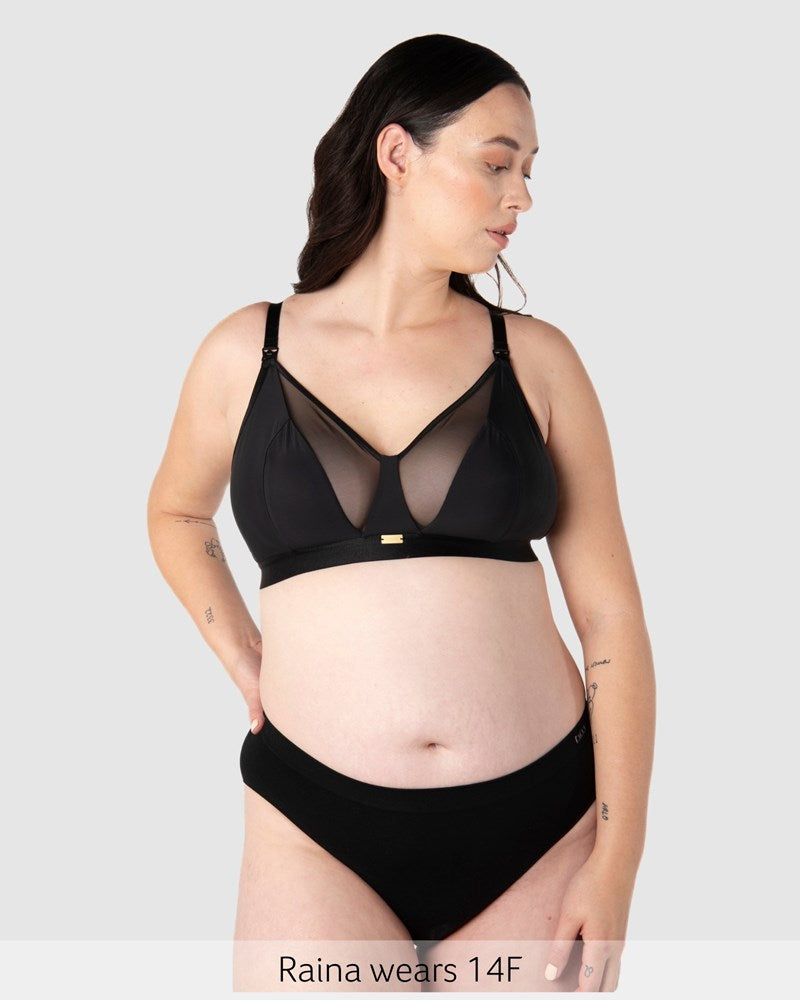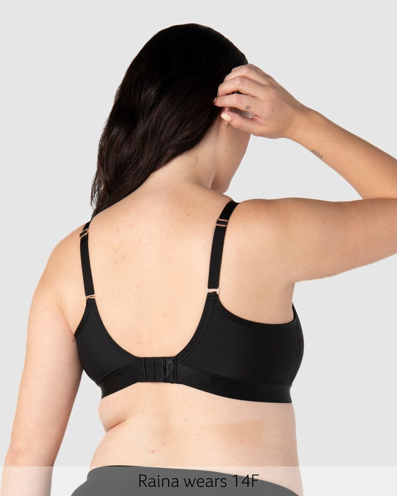 The look of a plunge with full cup support and coverage!�Smooth support and hidden shaping, the Flawless wirefree nursing bra offers everyday support up to a J cup- ideal for mums who need a little extra. Sleek 3-piece cup panels, double-layered bottom cups, and inner soft power mesh, providing wire-free comfort and support. Enjoy the lightweight look of a sheer plunge neckline and smoothing double-layer sides and back for added comfort. Made from certified recycled nylon that diverts pre-consumer waste from landfills.