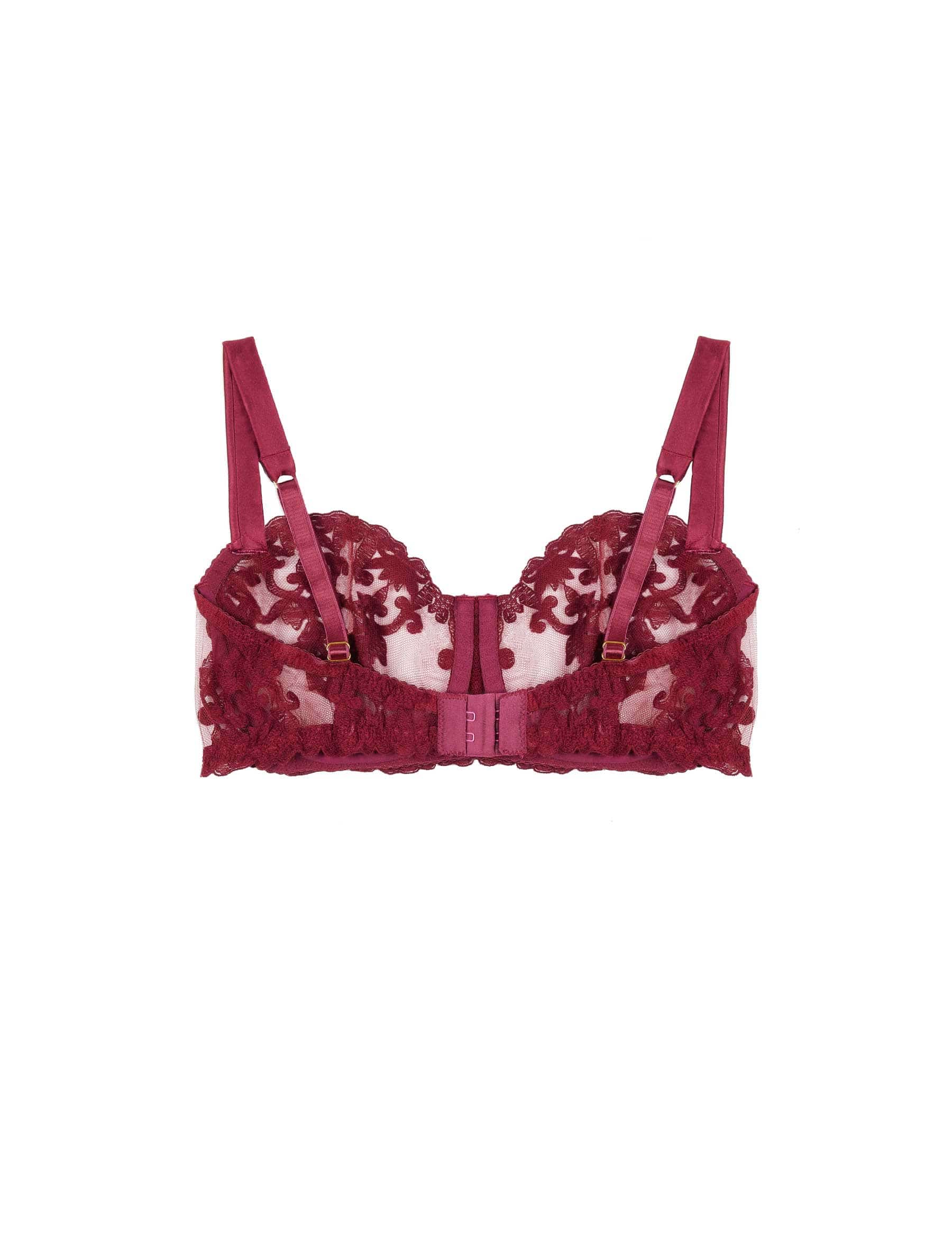 Introducing the captivating bespoke embroidery design that is Gisele. Born out of the Onyx bespoke embroidery, this best-selling embroidery design has been reimagined in an alluring shade of cranberry red. The Gisele balcony bra features Fleur’s hand-drawn embroidery on delicate sheer Italian tulle, finished with silk straps and 24-carat gold-plated hardware for a touch of elegant luxury. Crafted by our friends in Europe, the Gisele Balcony bra provides more coverage than our demi and plunge styles, offering a subtle uplift and a rounded shape.