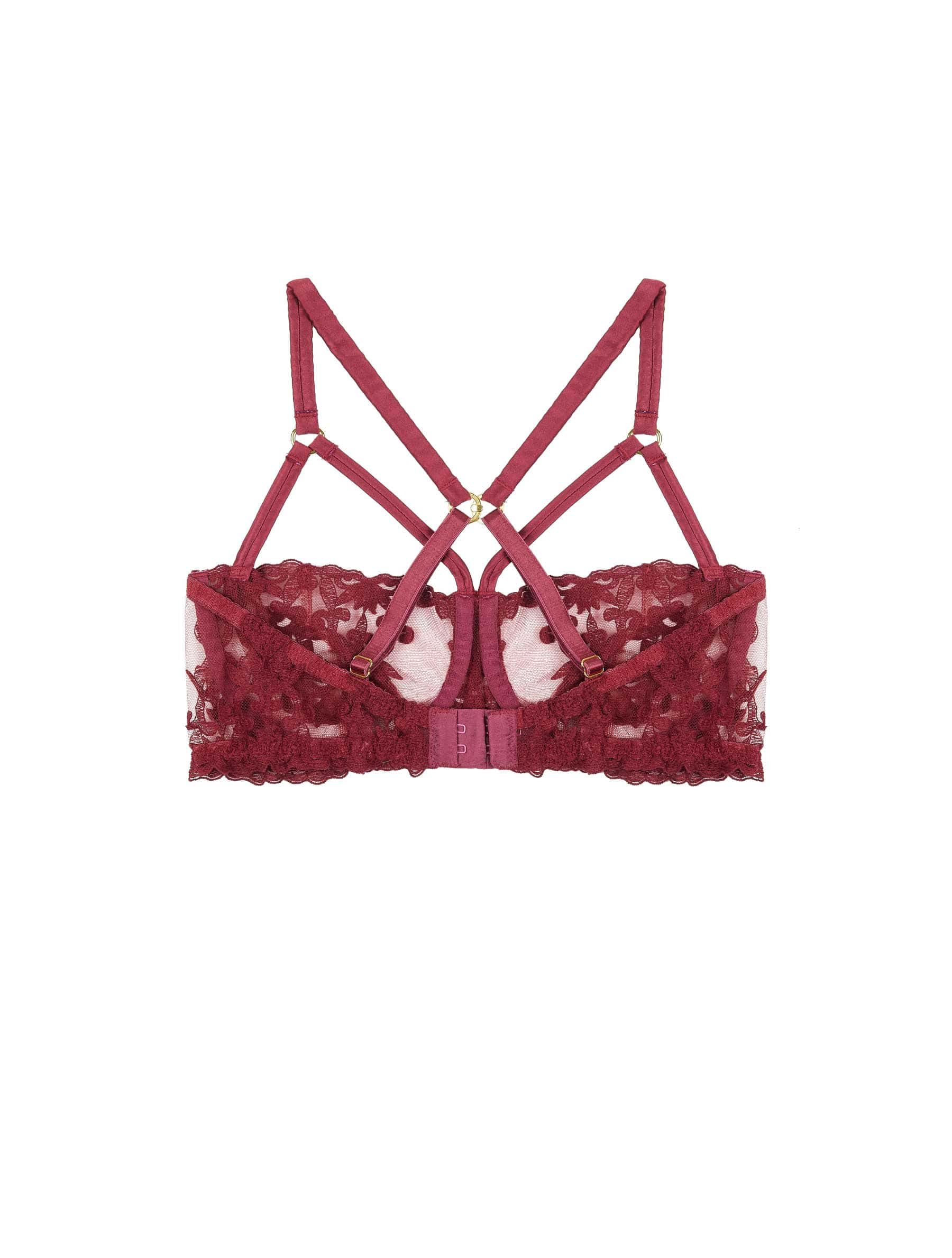The Gisele Strap Balcony Bra is for the bold. Designed to celebrate and empower women, this luxury lingerie piece features the iconic Onyx bespoke embroidery in a captivating shade of lustrous cranberry. Fleur’s hand-drawn embroidery is delicately placed onto soft sheer Italian tulle, while silk-encased straps seductively frame the bust, adding a contemporary edge to a classic style. Silk-encased shoulder straps are finished with 24-carat gold-plated hardware for an extra touch of luxury. The back of the garment features a unique design, with an adjustable clasp that offers the wearer the option of wearing this as a standard or racerback style.