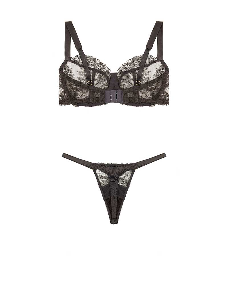 A fresh update to Fleur of England’s bestselling lingerie styles, the Kyra Balcony bra and thong set is presented in a rich shade of dark brown and features delicate hand-drawn embroidery paired with sheer Italian tulle. Meticulously crafted by our friends in Portugal, the complete matching set features the Balcony bra, designed for gentle uplift and an exquisite shape, paired with the bestselling silk side thong which features soft silk encased elastic straps for a flawless silhouette and finished with 24-carat gold plated rings, this luxurious set epitomizes European fine lingerie.