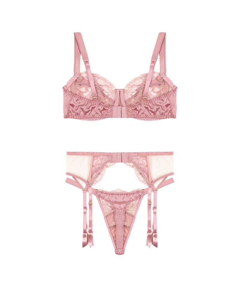 The Lyla Balcony bra, thong, and suspender belt is a timeless luxury lingerie set crafted from exclusive French eyelash lace in a floral design. Embrace the romance of the beautiful soft pink lace with three of Fleur of England’s best-selling silhouettes. Crafted by our friends in Portugal, the full set includes Our iconic lace balcony bra, the silk side thong, and the delicate suspender belt with panels of sheer Italian tulle that reveal glimpses of the skin beneath. A timeless lingerie set, expertly crafted and finished with 24-carat gold plated hardware for that extra touch of luxury.
