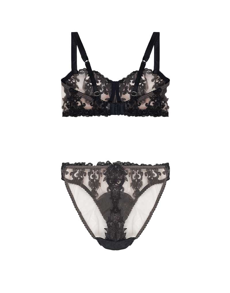 Refresh your luxury lingerie drawer with confidence with the bestselling Balcony bra and brief set from the iconic Onyx collection. This sophisticated underwired style is adorned in bespoke black embroidery, hand-designed by brand founder Fleur, whilst the soft, sheer Italian tulle melts away to seductively reveal glimpses of the skin beneath. Crafted in Portugal, the matching brief pairs bold embroidery with the softest black silk in this perfect everyday bikini brief silhouette, resulting in a luxurious lingerie set that elevates the everyday.