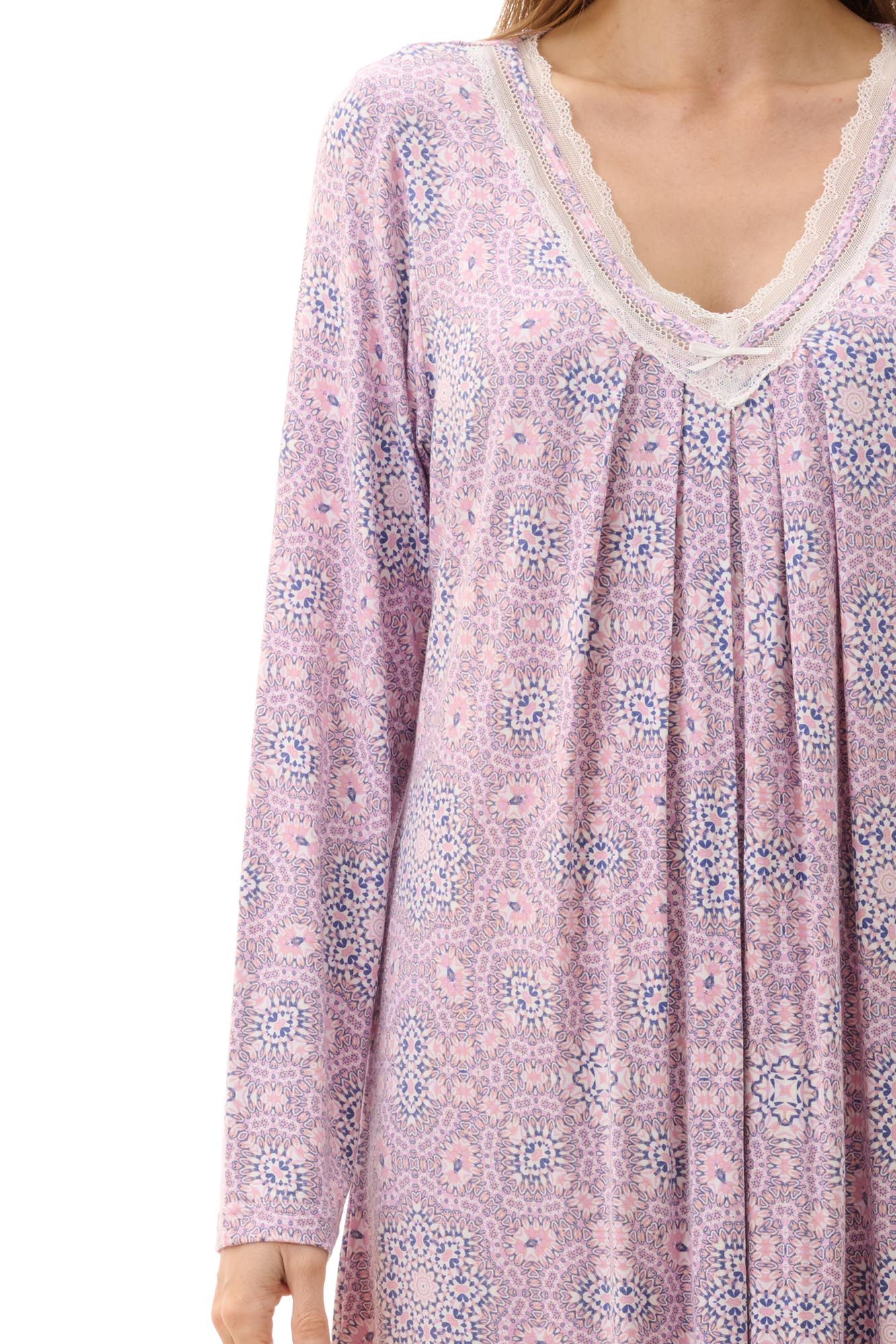 Short length nightie with long sleeves in the gorgeous pink Sarah print. The vee neckline features a white lace trim with flat self bind and pleats at the centre front.��A sweet pink satin bow adorns the front neckline.�MODAL knit is beautifully soft and comfortable.���
