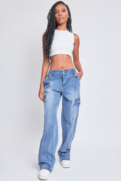 Step into the ultimate street-chic look with YMI Junior High Rise Straight Leg Cargo Jeans. These jeans are all about comfort and style, made with a soft stretch denim and an elastic waistband that makes them as easy to wear as they are trendy.