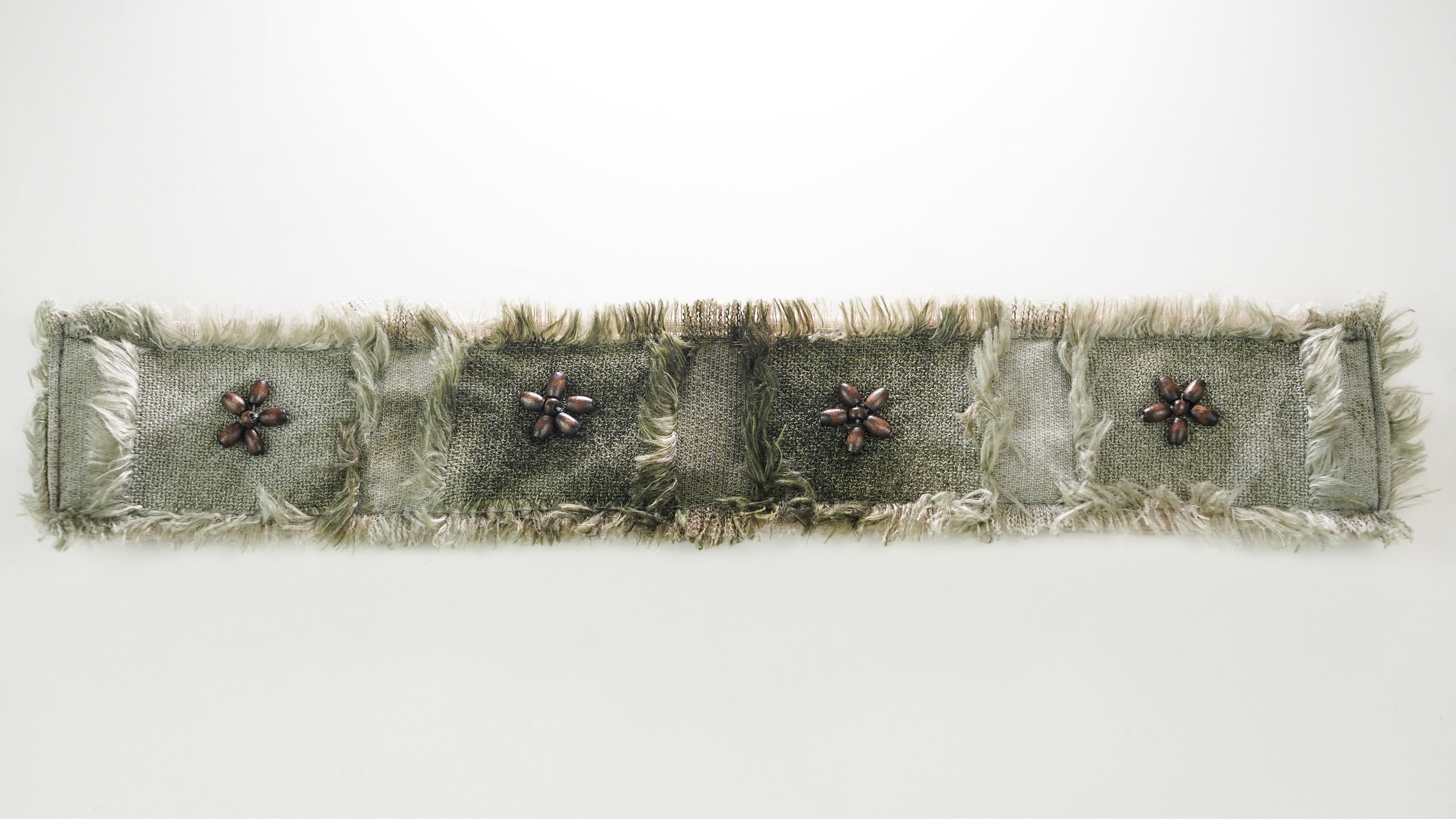 The perfect island getaway cover. Made of soft light green linen embellished with brown wood designed like flowers. To be worn with a breezy backless top or a maxi linen dress.