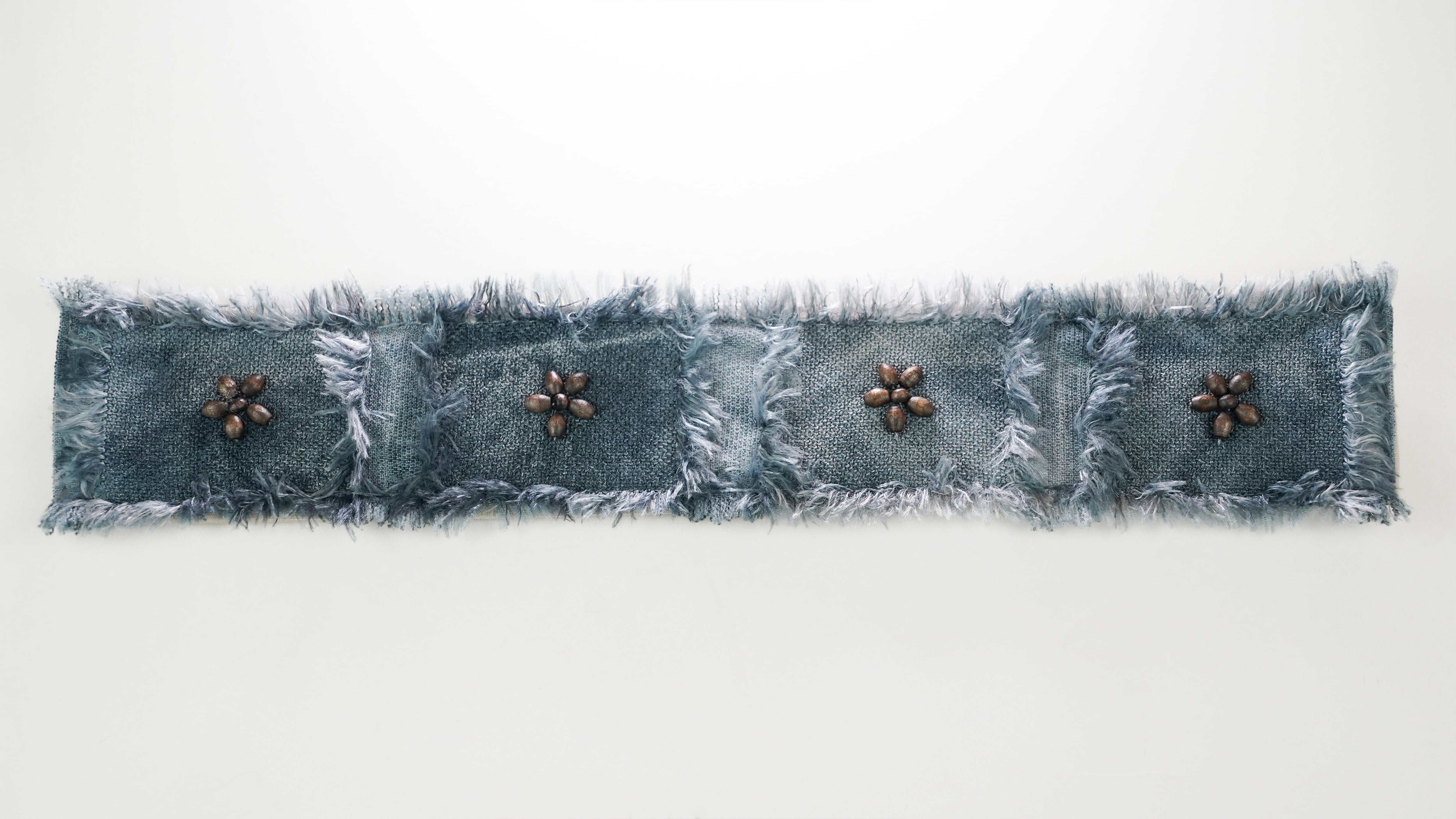 The perfect island getaway cover. Made of dark blue linen embellished with brown wood designed like flowers. To be worn with a breezy backless top or a maxi linen dress.